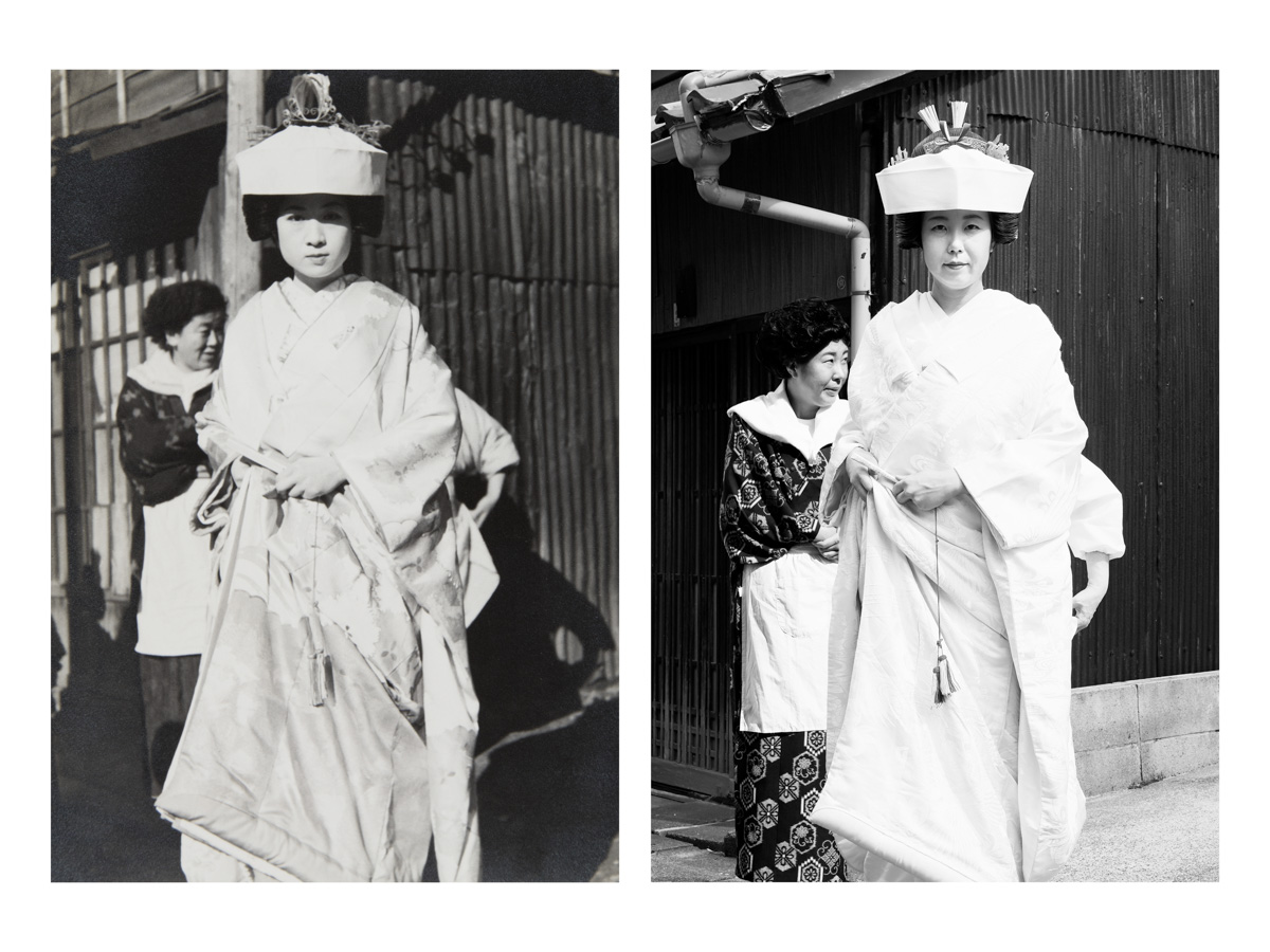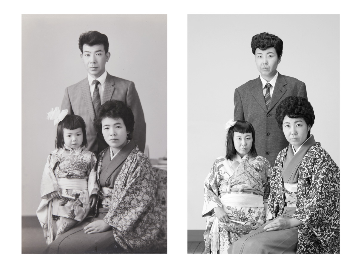 Description: (Re)construction of intimate and personal moments through self-portraits: "Familie werden" ("Becoming a Family"). Using old, found photographs of ten families - five from Germany and five from Japan - I humorously recreated the past, simultaneously as photographer and model. Foundations of a family are made up of stories built upon memories. Moreover, the notion of a family is historically and culturally universal. Thus, family photographs of even complete strangers reflect the viewer's own experiences and memories and evoke a certain nostalgia and empathy. Family albums are usually put together by a family member, often to document a certain chapter or for a particular purpose. In a way, the stories of these ten families also have come to a new chapter, where their stories are carried forward by the hands of a stranger. I slink into their stories and become part of the family. The stories of these families weave in and out of memory and oblivion, fiction and reality. This project brings back to life these family photographs, which once had been left behind.