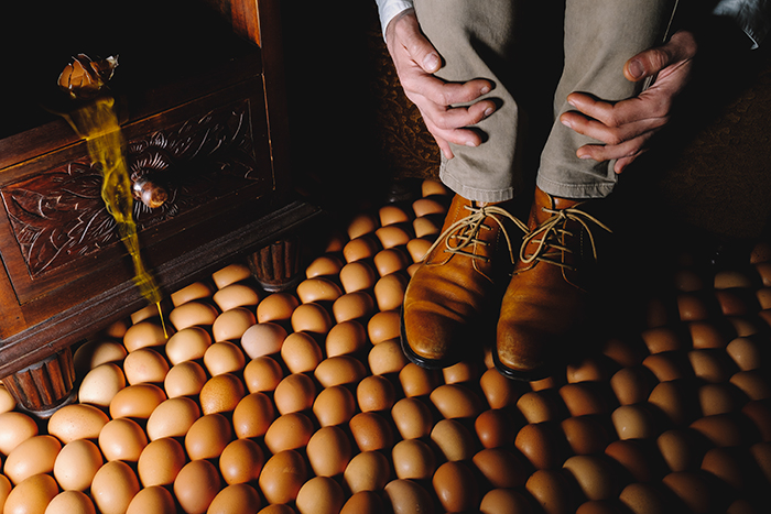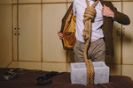 Description: The ongoing photography project titled “Monologues” consists of a series of conceptual self - portraits. It is the result of editing heterogeneous episodes tracing the human condition; the result of fermenting the tragic and comic parts of life. The individual scenes adopt a theatrical approach where abstraction, paradox, absurd and repetition weave a claustrophobic thread around the human subject, without offering any sort of redemption or solution. The setting indicates an unknown place; the place of existential quest and metaphysical human agony levitating between the truth and the fiction of existence, the contingency and the uncertainty of life while embellished with sarcasm and irony. Monologues of a tragic comedy or a comic tragedy.