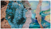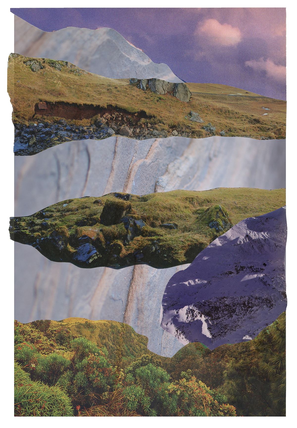 Description: In its current form, the natural landscape appears fixed in the state it inhabits. Although it transforms over time, we always physically experience the land in the present as it exists today. Rock formations are solid, bodies of water adhere to their boundaries and tidal patterns, and the sky is always above us, but the echoes of a place’s history are not always apparent on its surface. Unbound Spaces offers visual interpretations of how natural elements can be reimagined through their fluid evolutions in space and time. By layering physical images cut out from magazines with digital images of natural patterns and surfaces, the new compositions become obscured depictions that blur the lines between what is real and what is surreal. Throughout this series of work, landscapes are fragmented into multiple pieces and intertwined with photographs from various locations, breaking their boundaries of natural order. The images in Unbound Spaces also question the linear timeline of changing environments and what constrains them in their present states. Which elements of our physical surroundings are natural and which are fabricated? How are we bound to spaces as individuals and how do we bind them to ourselves? Rather than answering these questions, the collaged forms remain open-ended for the viewer to project their own perceived interpretations and conclusions.