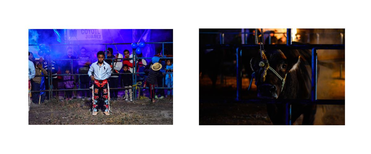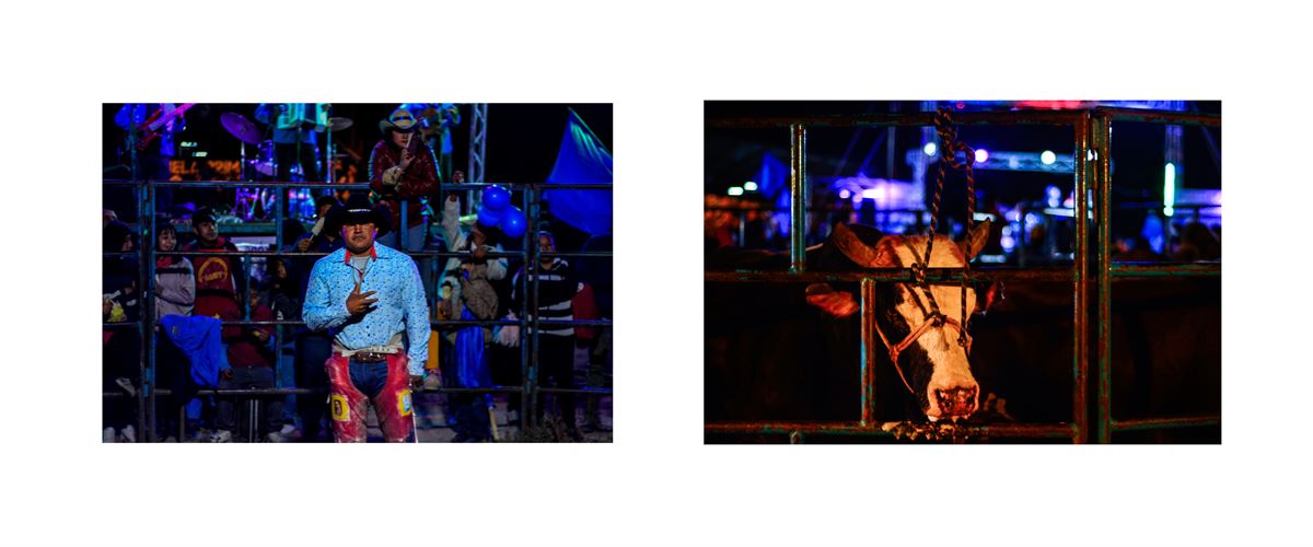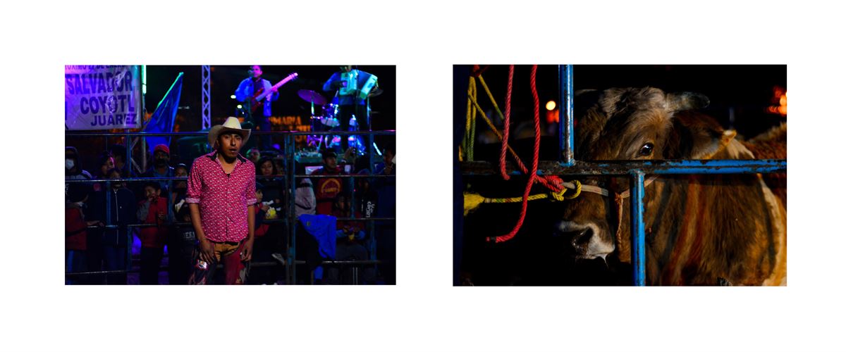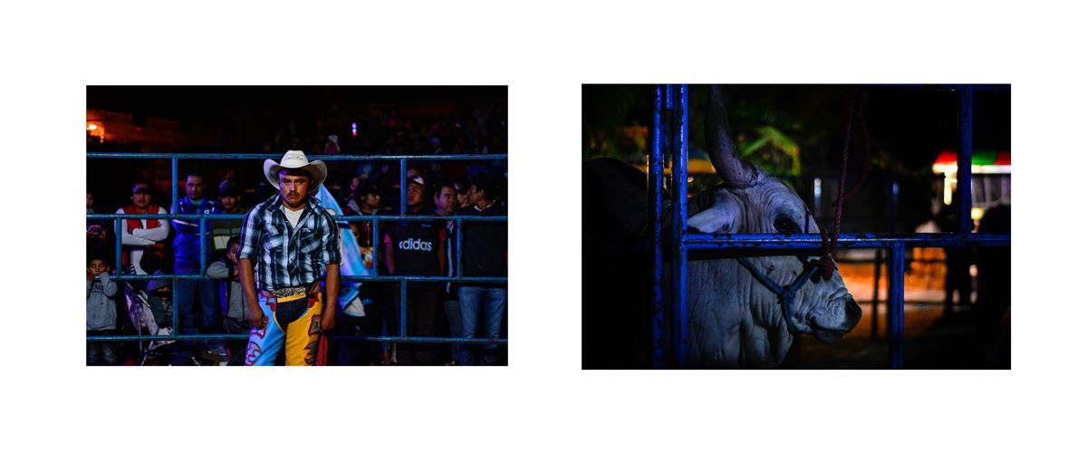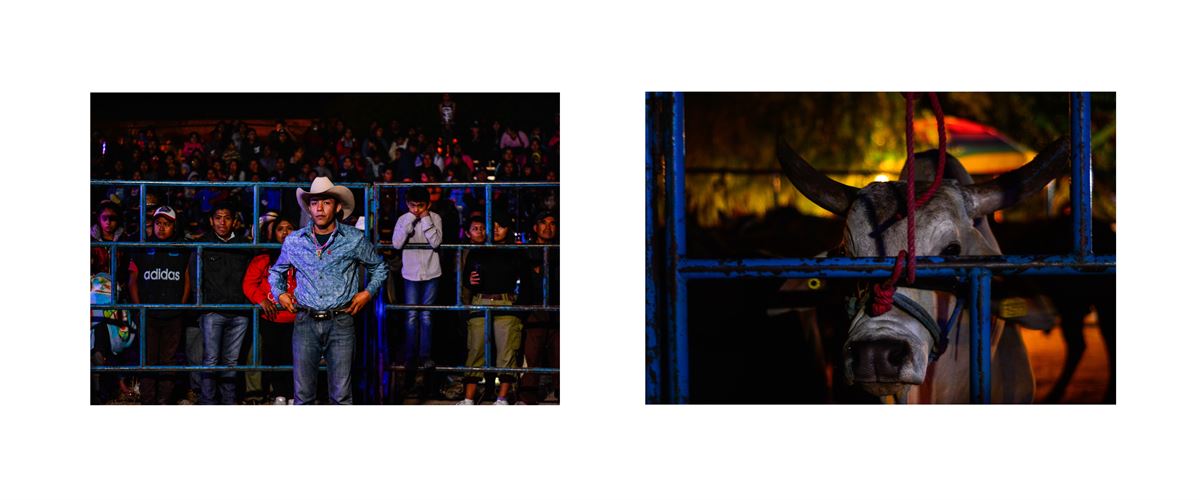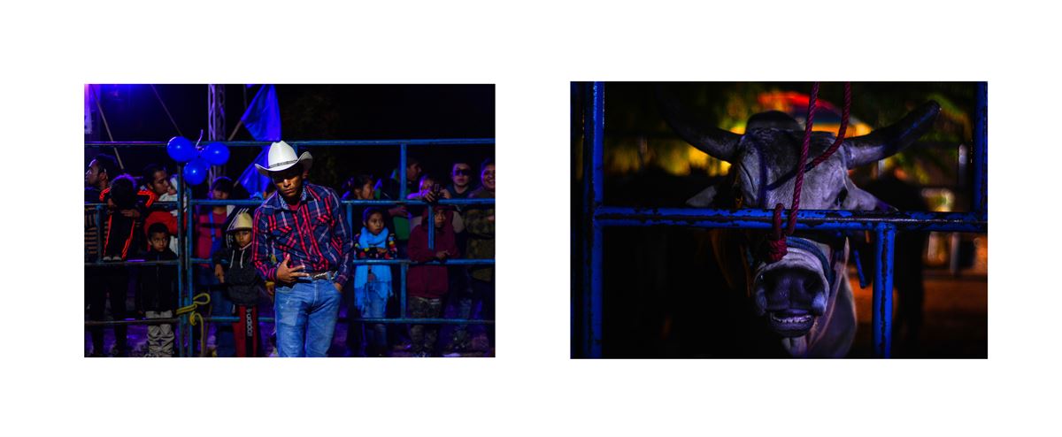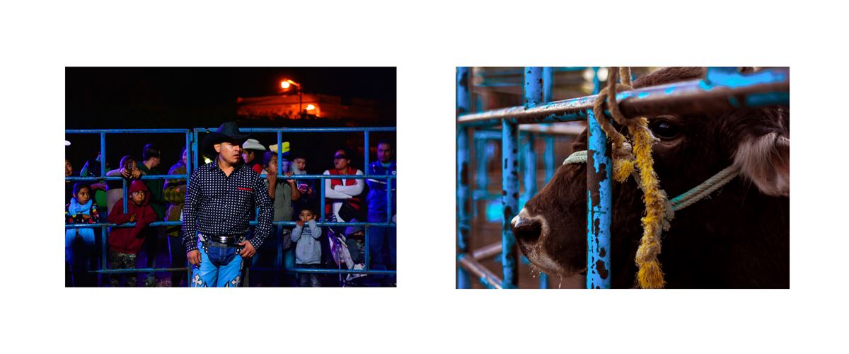 Description: Photographs depicting the relation between the rider and the beast - the bull, who will fight for a minimum period of 8 seconds during which the rider will tame the jerks of the bull. These photos are taken just before the confrontation; the opponents do not know each other, but still it seems that somehow they do and that there is a bond between them that makes them face each other from the moment they touch the land of the corral, always ready to attack each other. This is the Mexican jaripeo (bull rider).